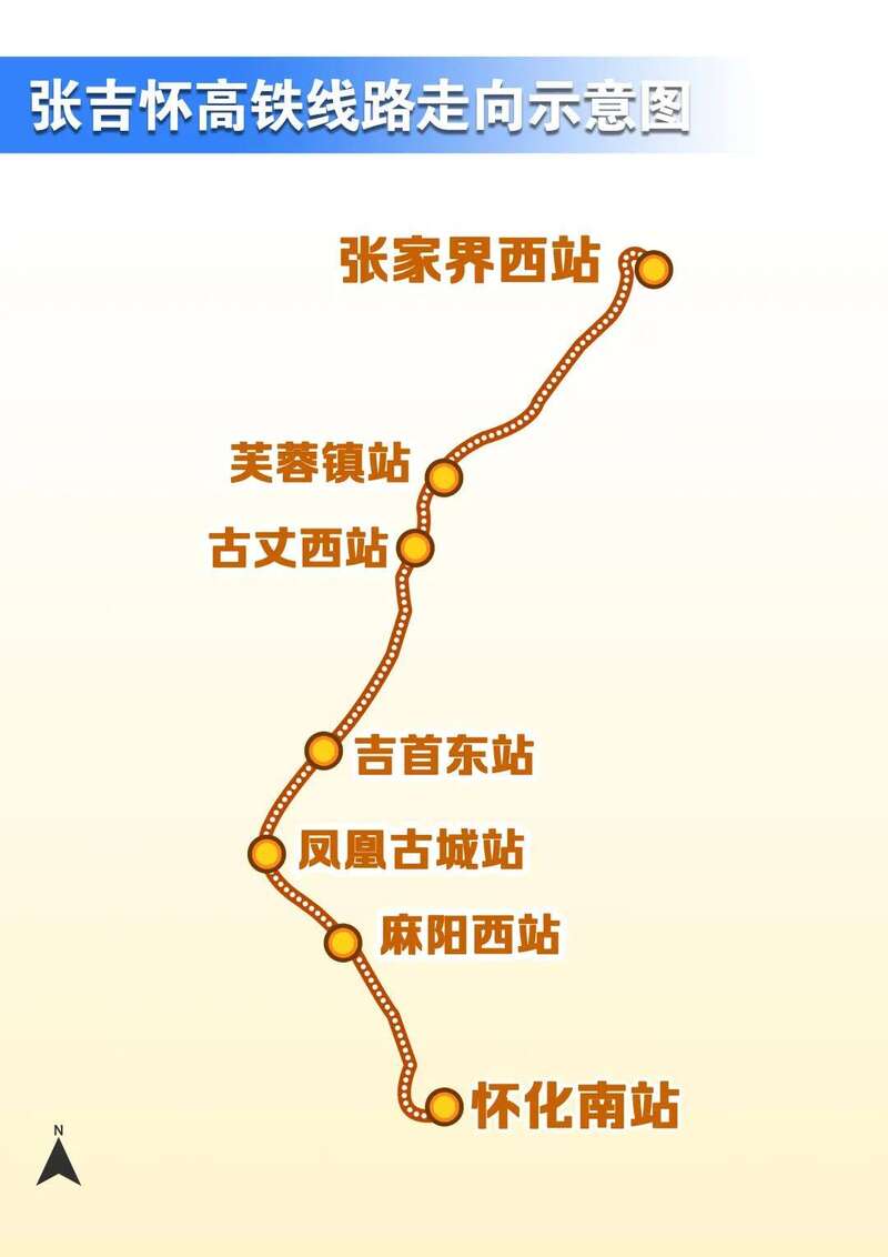 张吉怀高铁位于湖南省西部,作为“八纵八横”高速铁路网的区域连接线,北接渝厦高铁黔常段,南连沪昆高铁、怀衡铁路,全长245公里。 全线设7个客运车站,北起张家界西站,途经湘西土家族苗族自治州永顺县、古丈县、吉首市、凤凰县和怀化市麻阳苗族自治县,南至怀化南站。