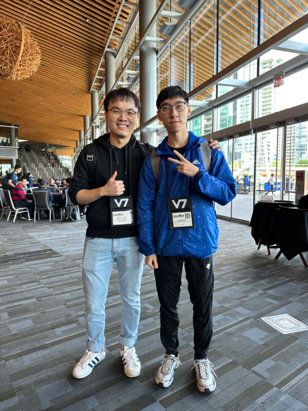 在参加CVPR2023会议期间,刘翼豪偶遇同为国科大2014级本科毕业生同学何博(现在美国马里兰大学攻读博士学位)