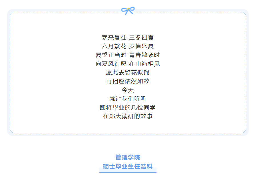 最后,我想对即将毕业的同学们说,郑州大学给予了我们无尽的宝贵资源和机遇,而我们的成长离不开自己的努力和付出。无论将来选择什么样的道路,让我们怀揣着感恩和自信,勇敢地迈向未来,继续书写属于自己的精彩篇章!祝愿每一位同学在郑大度过难忘的研究生时光,成长为杰出的人才,为社会的进步和发展做出积极的贡献。加油!