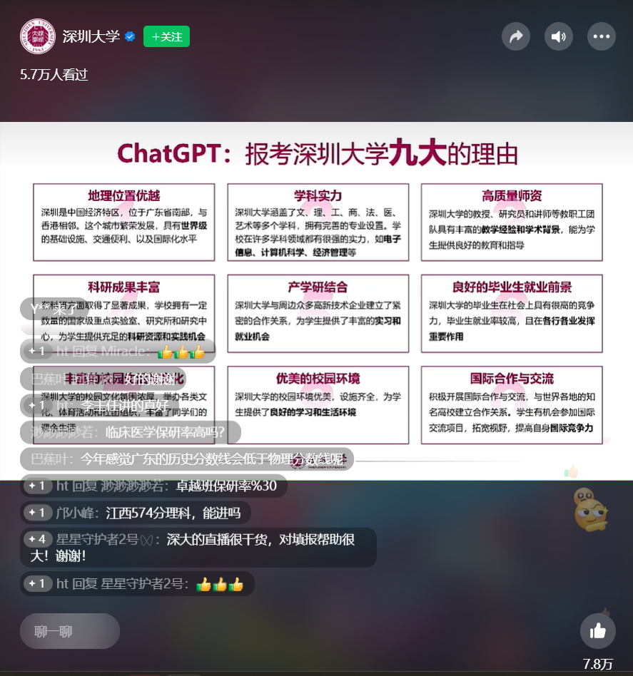 除了让考生和家长实地参观和了解教学“硬”资源,深圳大学还安排了心理学院、计算机与软件学院、物理与光电工程学院、高等研究院、机电与控制工程学院5个学院的公开课,让考生和家长深度体验学校的教学“软”实力。其中《人工智能新时代一ChatGPT带来的机遇与挑战》《火星“天问一号”探测任务的“所见所闻”》公开课紧跟科技前沿和热点。这些学院均拥有ESI世界排名前1%的学科或侧重跨学科教学与学术研究、尖端科学研究和高新技术开发,培养创新人才。
