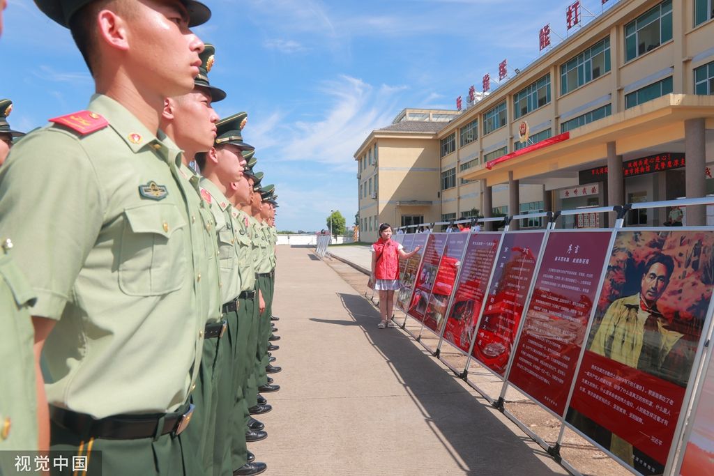 2023年6月28日,江西鹰潭,鹰潭市“八一”小学红色讲解员为武警鹰潭支队官兵讲述方志敏烈士的英雄事迹。