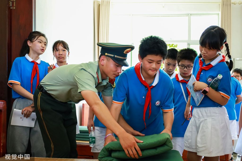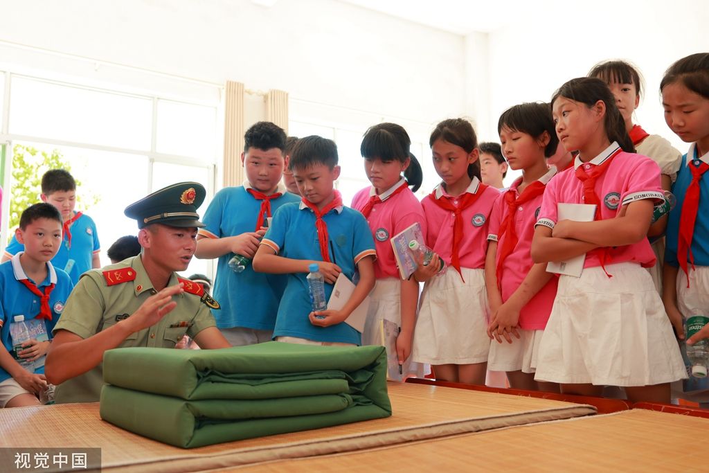 2023年6月28日,江西鹰潭,武警鹰潭支队官兵教鹰潭市“八一”小学学生叠被子。