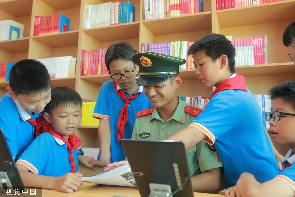 2023年6月28日,江西鹰潭,武警鹰潭支队官兵与鹰潭市“八一”小学在书香军营阅读书籍。