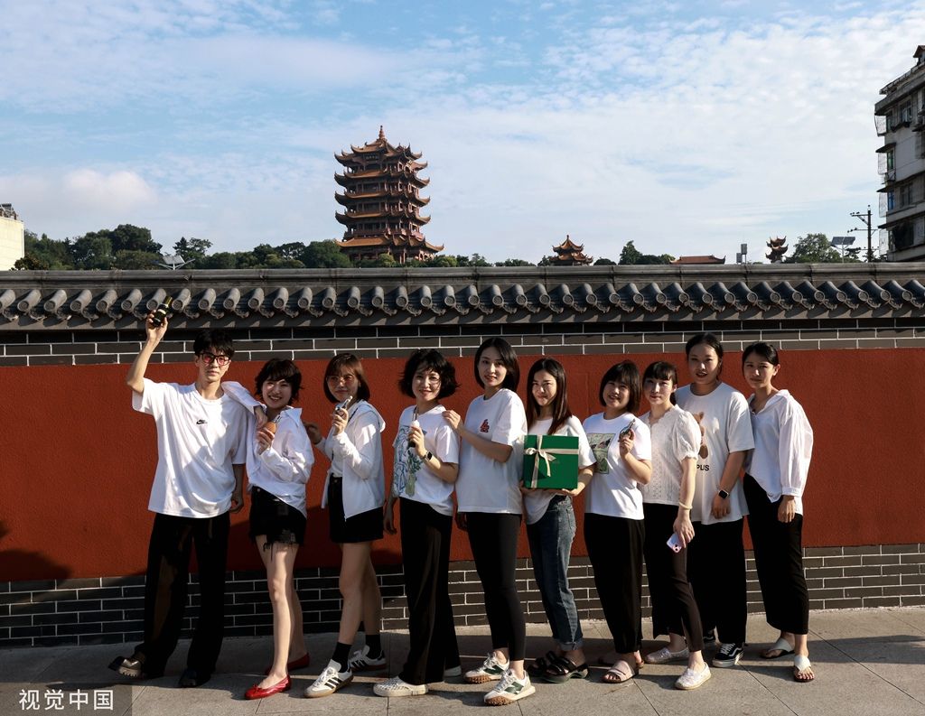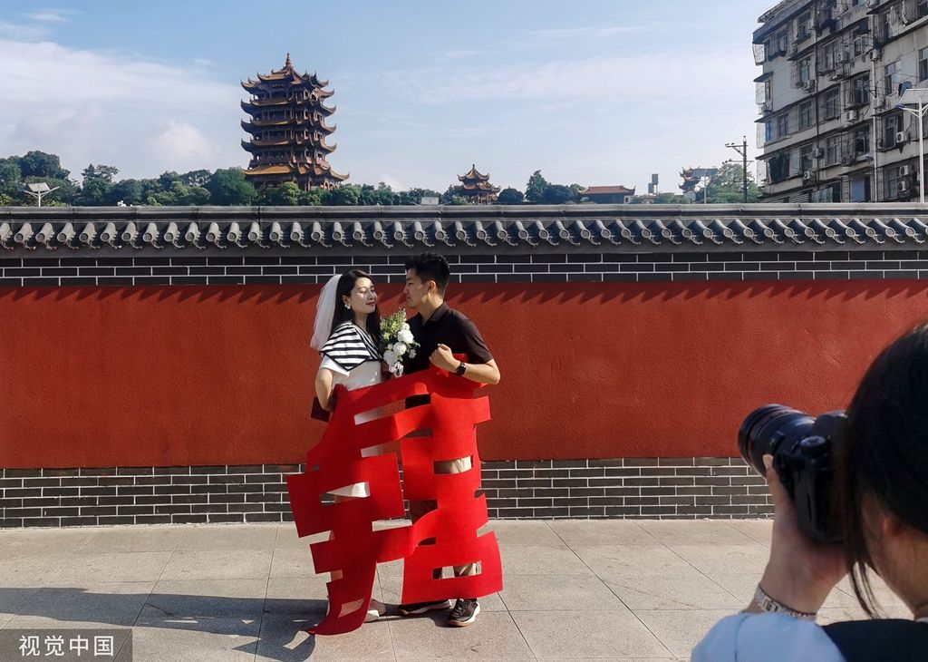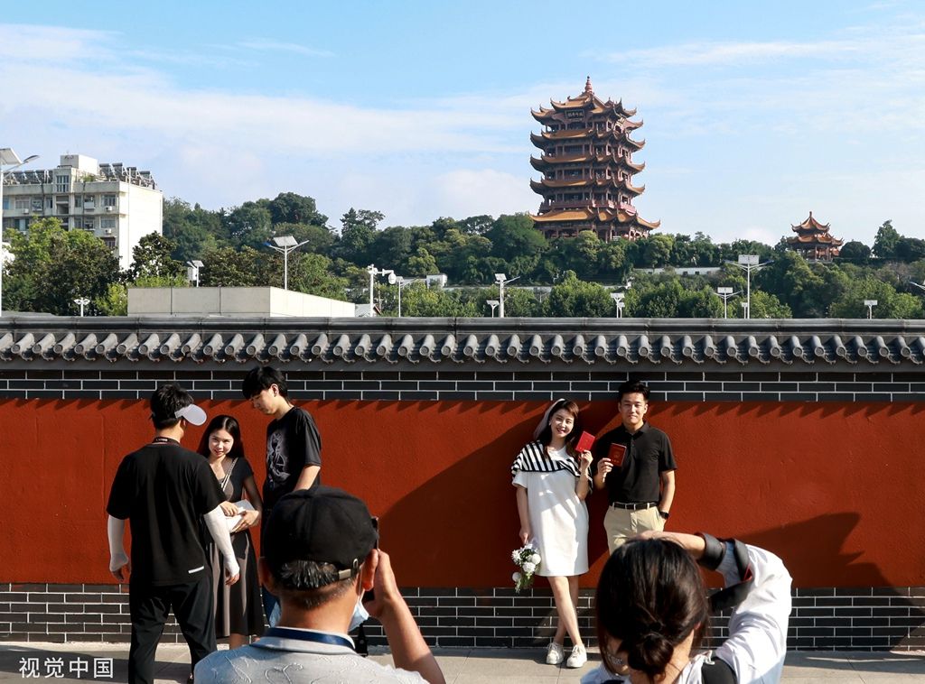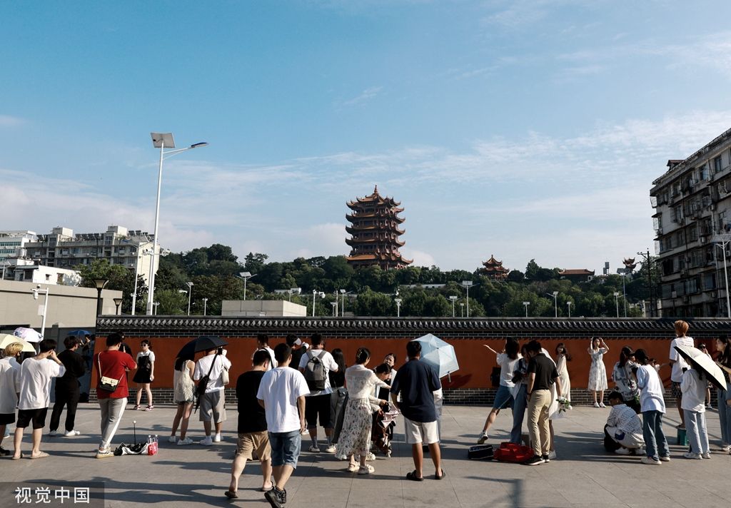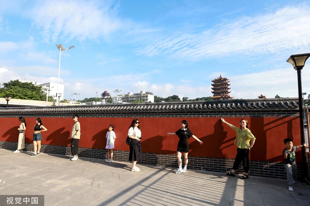 2023年6月30日,武汉,地铁5号线司门口黄鹤楼站C出口一面新修建的红墙成为当地新晋网红打卡地,前来拍照的市民游客络绎不绝。