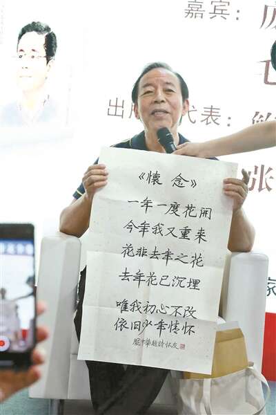 庞中华出道33年以来,出版专著430本,发行近3亿册。而事实上,庞中华对诗歌的热爱早于硬笔书法。纪念现场说起老友,庞中华感慨万千,他评价汪国真非常真诚、可爱、阳光,“跟他做朋友你可以放心,而他的诗如其人,像一阵清风积极阳光地影响了一代年轻人。我觉得汪国真的诗打动了年轻人的心,感动了那一代年轻人,每一句都是那么的青春、那么的活泼、那么的可爱,我是先读了他的诗,再认识的他这个人,他太可爱了,你们要是见了汪国真都会喜欢他的。”庞中华说现在报刊上的诗很少能像汪国真的诗那样打动他了:“他们写得也很好,但是有些诗一行二十个字,一行两个字,我就不爱读了,汪国真的诗里是没有这种情况的。我就希望再出现一个汪国真式的人物,唤醒年轻人的心,那个时候有多少年轻人喜欢他的诗。”