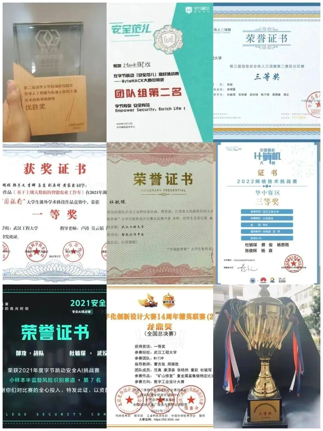 他们一路披荆斩棘,还获得了第十三届湖北省“挑战杯”大学生学术科技作品竞赛一等奖、第二届清华大学国强研究院杯技术创新赛初创组全国优胜奖,第十一届“中国软件杯”大赛全国三等奖,2020年第二届字节跳动安全范儿高校挑战赛 ByteHack 团体组第二名等多项荣誉。