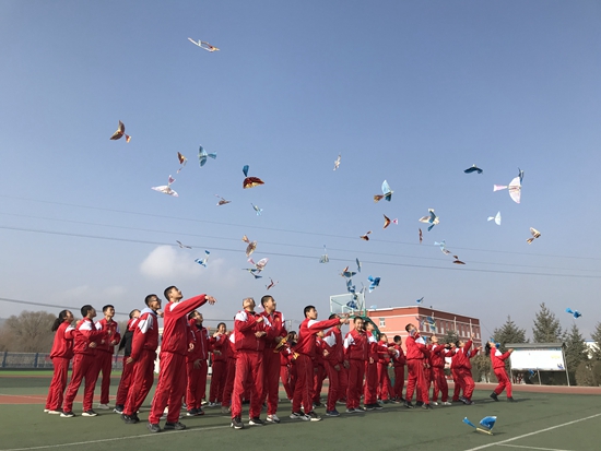 2019年11月14日,宁夏回族自治区固原市西吉县袁河中学学生参加航模表演。袁河中学供图