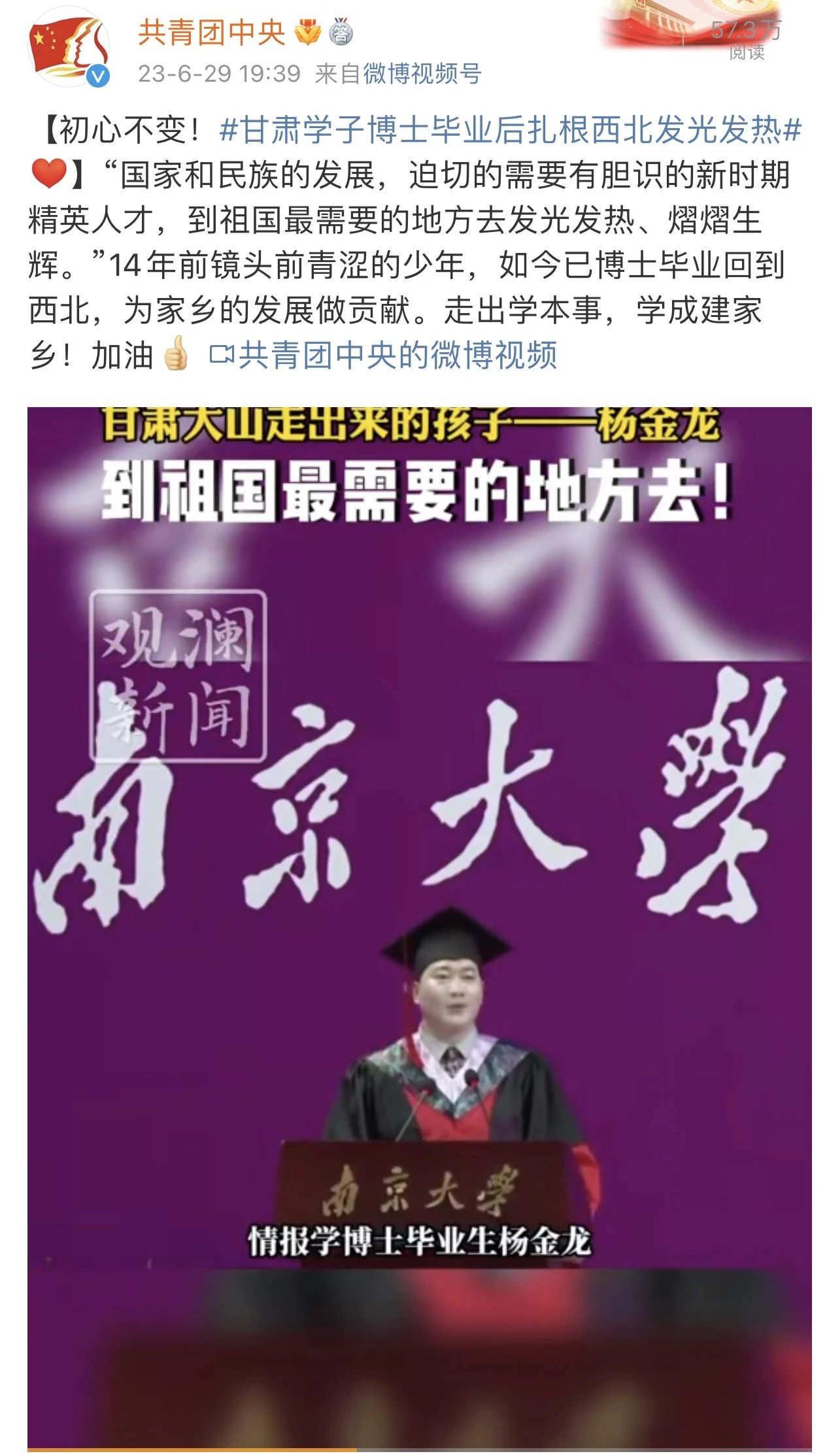 初心不变,到祖国最需要的地方去!这两段视频经过剪辑,得到了共青团中央官方微博的推送和点赞,#甘肃学子博士毕业后扎根西北发光发热#词条迅速登上热搜。杨金龙在毕业典礼上的振臂一呼,得到了多位网友的回应,“走出学本事,学成建家乡”,网友们感动得热泪盈眶。