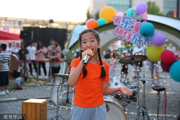 2023年7月8日,天津,孩子们在现场展卖及才艺展示。
