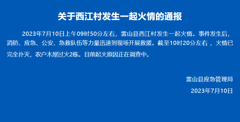 2023年7月10日上午09时50分左右,雷山县西江村发生一起火灾。事件发生后,救援力量迅速到现场开展救援。10时20分左右,火已扑灭。