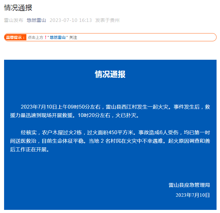 7月10日上午10时左右,贵州西江千户苗寨景区突发火灾。“悠然雷山”微信公众号就此事发布通报。