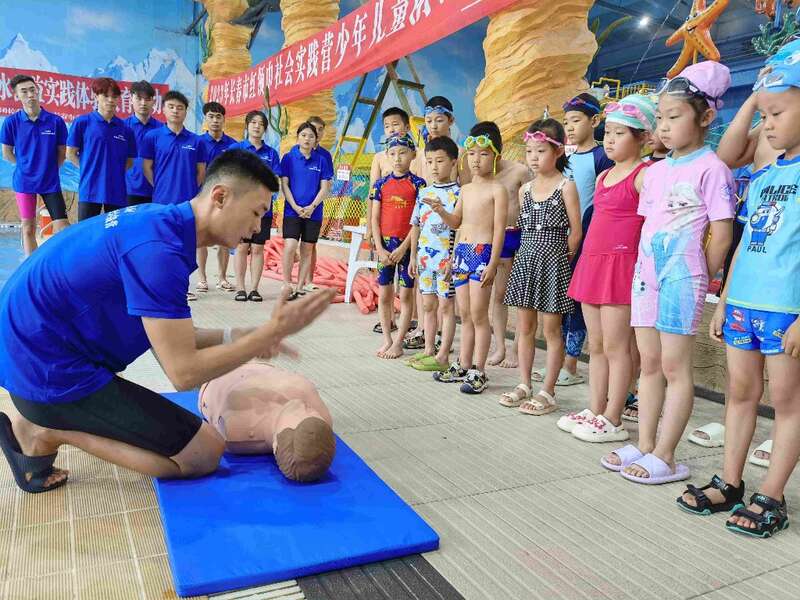 仪式结束后,首批50名红领巾社会实践营学员来到游泳馆参加实践体验教育活动。教练通过集中授课、分区实践的方式,讲解水中安全常识、对水中突发应急处理方法进行实操及示范、现场教学心肺复苏等,让学员掌握自救技能。