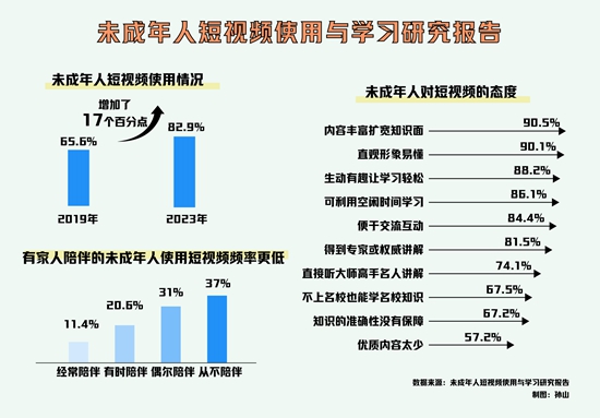 自然科学、历史地理、艺术美育、体育健康……随着短视频的快速发展,各类知识在短视频平台汇聚,短视频已经成为专业科普和大众学习的新工具。 报告显示,82.9%的受访未成年人使用过短视频。与2019年的调查相比,“丰富知识”在未成年人使用短视频的原因中排序上升至第二位,未成年人通过短视频学习的需求增强。