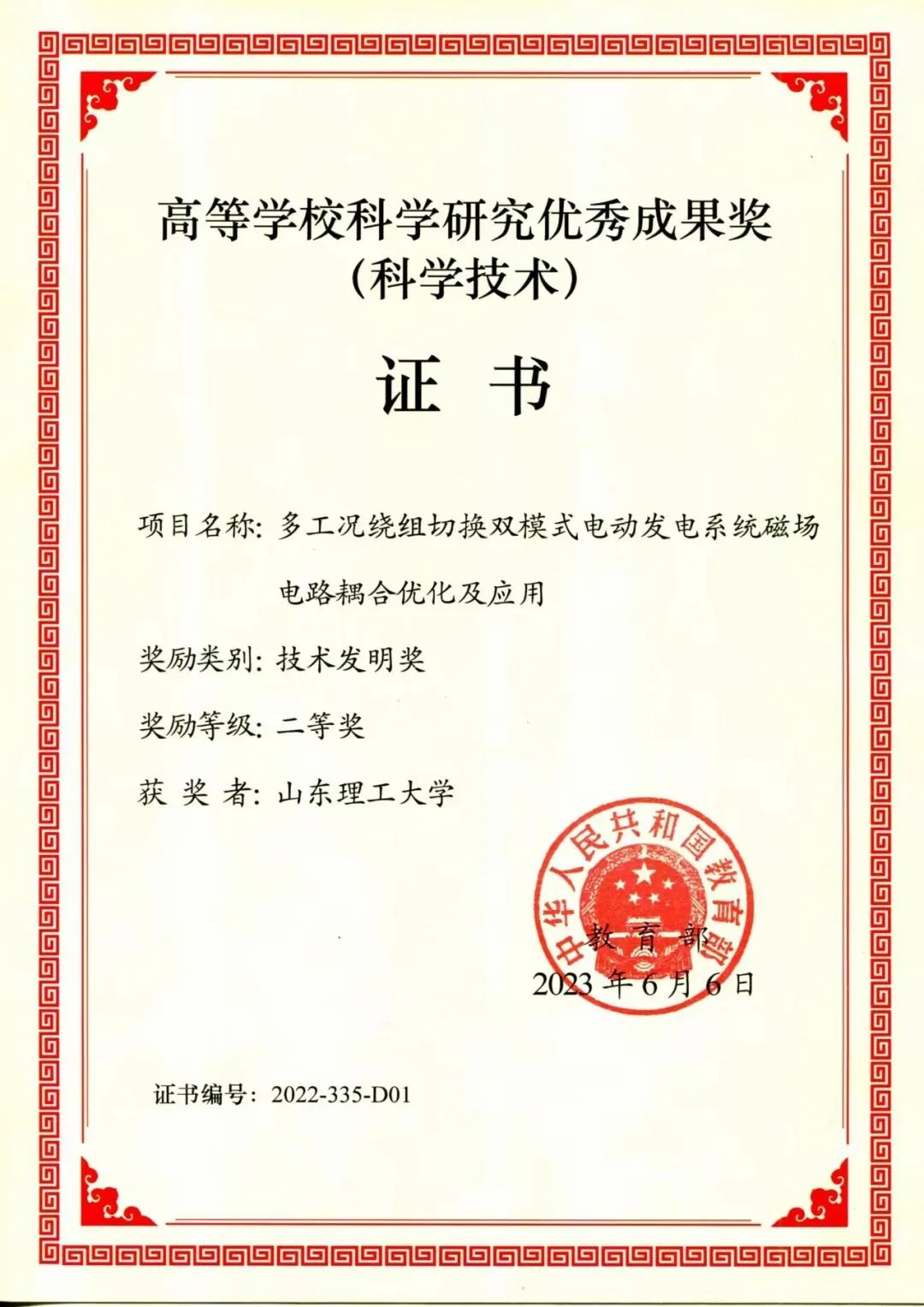 近日,教育部颁发 2022年度教育部高等学校科学研究优秀成果奖(科学技术) 获奖证书,山东理工大学交通与车辆工程学院史立伟、李波、张学义等教授牵头完成的 “多工况绕组切换双模式电动发电系统磁场电路耦合优化及应用”项目荣获技术发明二等奖 ,这是自山东理工大学2013年主持获得、2016年参与获得以来再一次荣获教育部高校科研优秀成果奖(科学技术)。