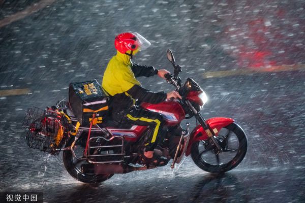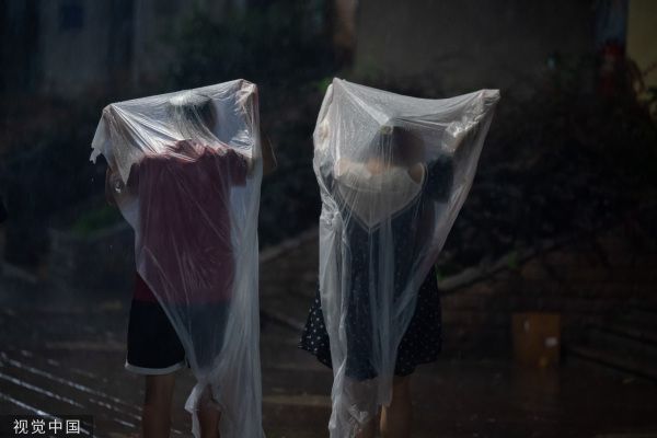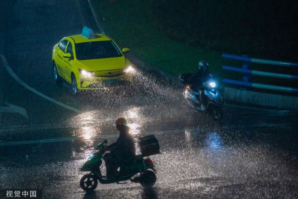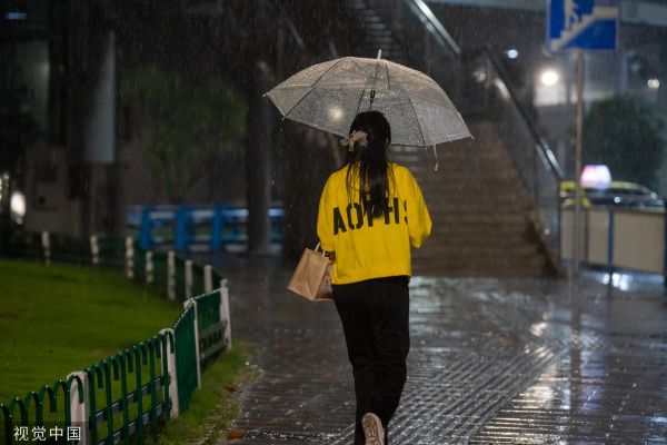 2023年7月13日晚,重庆中心城区出现暴雨天气,市民在雨中穿行。