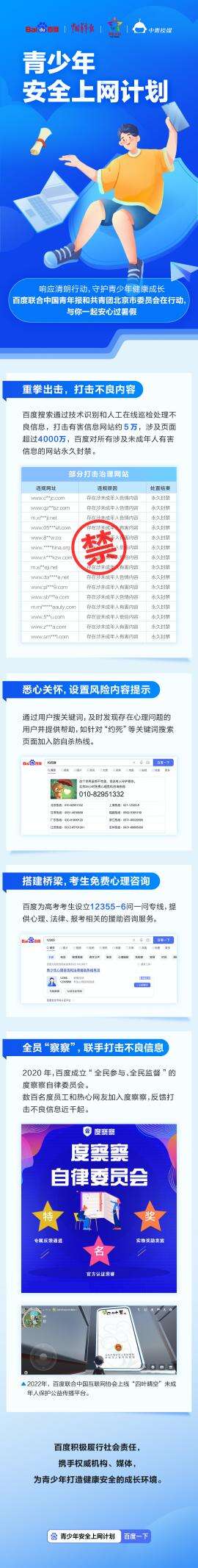 中国青年报客户端讯(中青报·中青网见习记者刘俞希)暑期来临,如何为青少年创造一个安全、健康的网络环境,成为社会各界关注的焦点。7月7日,百度搜索、共青团北京市委员会、中国青年报社和未来网共同推出“青少年安全上网计划”,从不良内容治理、风险内容提示、心理关怀、正向内容传递、举报措施等方面多管齐下,一同为青少年网络安全保驾护航。