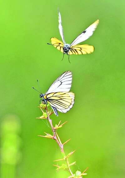 灌木丛的一处空地里,一只白色粉蝶飞过,引起了我的注意——这飞行姿势不对呀,我高度警觉起来。粉蝶的飞行,都是轻盈的略带跳跃的,但这一只不同,它似乎有着更笨重的腹部,尽管翅膀努力扇动着,飞行线路却很平滑,向前的速度也缓慢,一点也不形成跳跃。
