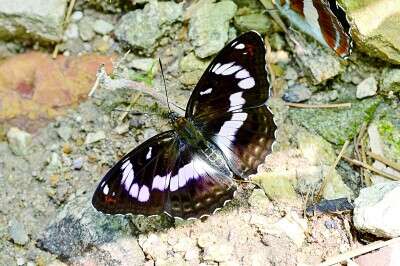 上行800多米的时候,我停住了脚步,路边的一小堆乱石上,几只蛱蝶让我眼前一亮。六点带蛱蝶、重环蛱蝶、银白蛱蝶……它们中,还有一种我从未见过的蛱蝶,中等大小,正前后翅的白斑连接成一个不规则的U形。我趴下去,趁它举翅时观察反面,确认是线蛱蝶属的,于是瞬间想起在图鉴上见过此种——折线蛱蝶。活生生的它,可比图鉴上好看太多了。