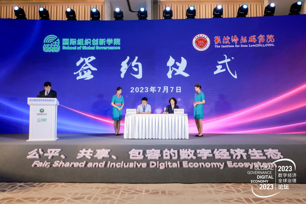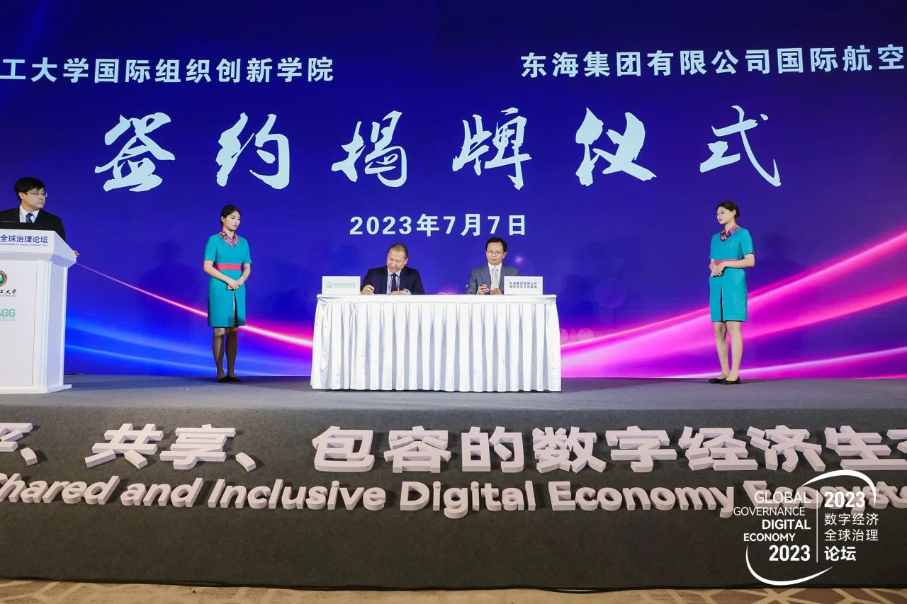 论坛上,北京理工大学国际组织创新学院与中国政法大学数据法治研究院、东海集团有限公司国际航空总部基地分别签署《战略合作协议》,并向东海集团国际航空总部基地颁授“数字经济治理创新中心”牌匾。