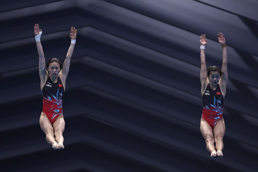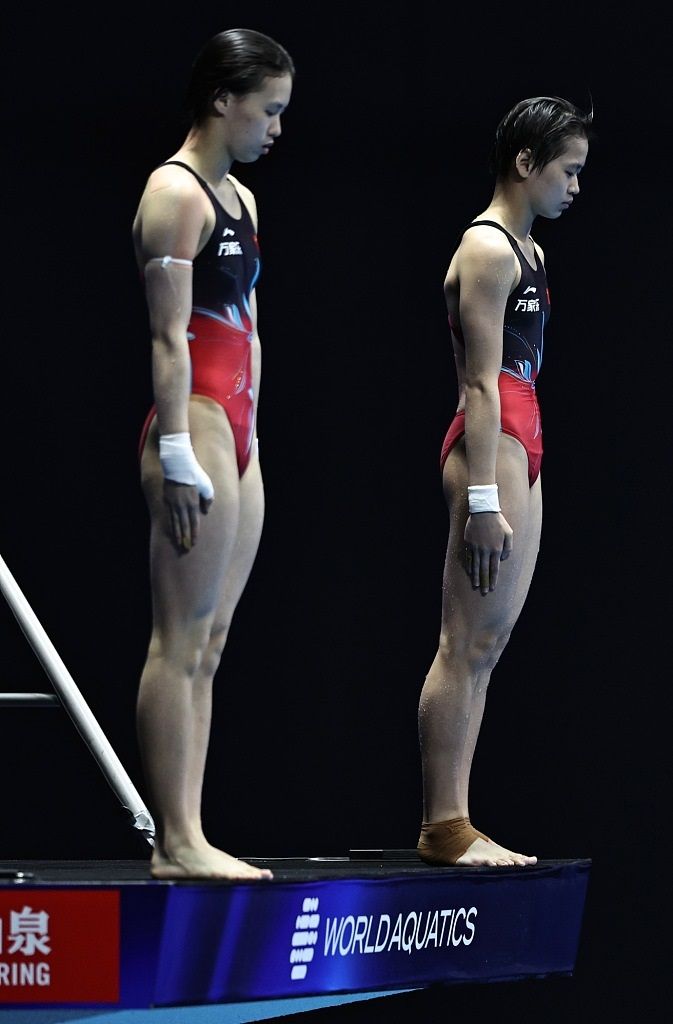 在刚刚结束的2023年福冈游泳世锦赛跳水女子双人10米台决赛上,卫冕冠军、中国组合陈芋汐/全红婵一路领先,毫无悬念地夺冠。这也是中国跳水队在本届世锦赛上夺得的第五枚金牌。当对手们为总分超过300分苦苦努力时,陈芋汐/全红婵最终的得分达到了369.84。断层式的领先优势,也意味着陈芋汐/全红婵的唯一对手就是自己。从这场比赛的技术统计看,裁判给陈芋汐/全红婵打出了多达11个10分,而且是五轮比赛,每一轮都有10分。而对手们想上9分都很难。(中青报·中青网记者慈鑫,视觉中国供图)