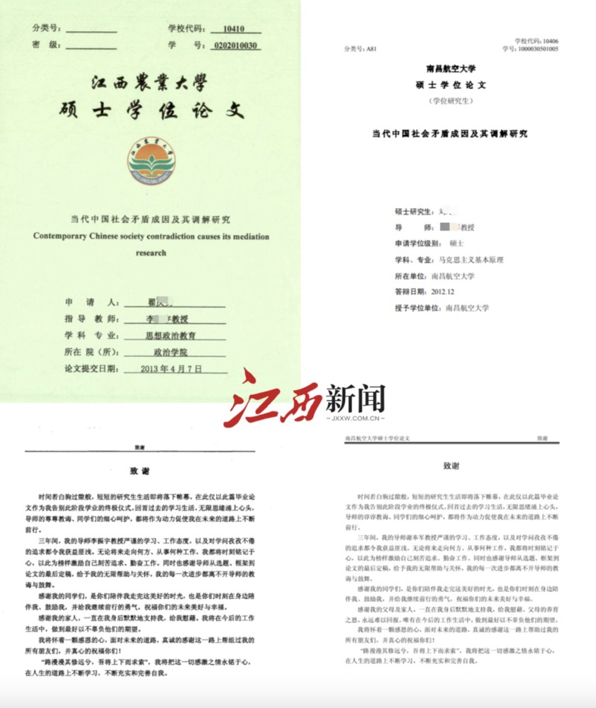 据江西新闻客户端消息,记者查询知网发现,翟某某2013年发表的硕士学位论文《当代中国社会矛盾成因及其调解研究》,与2012年南昌航空大学马克思主义基本原理专业学生刘某某发表的硕士学位论文《当代中国社会矛盾成因及其调解研究》,在标题、摘要、关键词、正文的结构、内容及图表等雷同或高度相似,多个段落一字不差,论文中的致谢、参考文献部分都几乎相同。