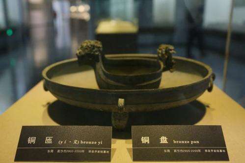 东周铜盘、铜匜,距今2000余年,2001年于郧阳区五峰乡肖家河境出土。