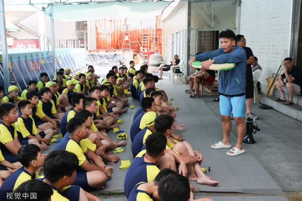 2023年7月16日,江苏连云港,暑期中的学生在赣榆区的一家游泳馆学习游泳。