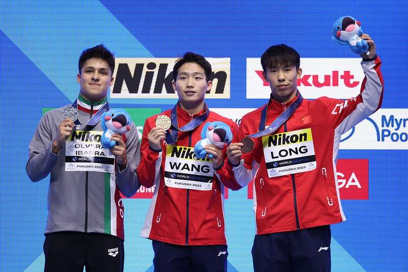 获得本届游泳世锦赛跳水男子三米板前三名的选手,左为获得亚军的墨西哥选手奥斯马尔,中为获得冠军的中国选手王宗源,右为获得第三名的中国选手龙道一。视觉中国供图