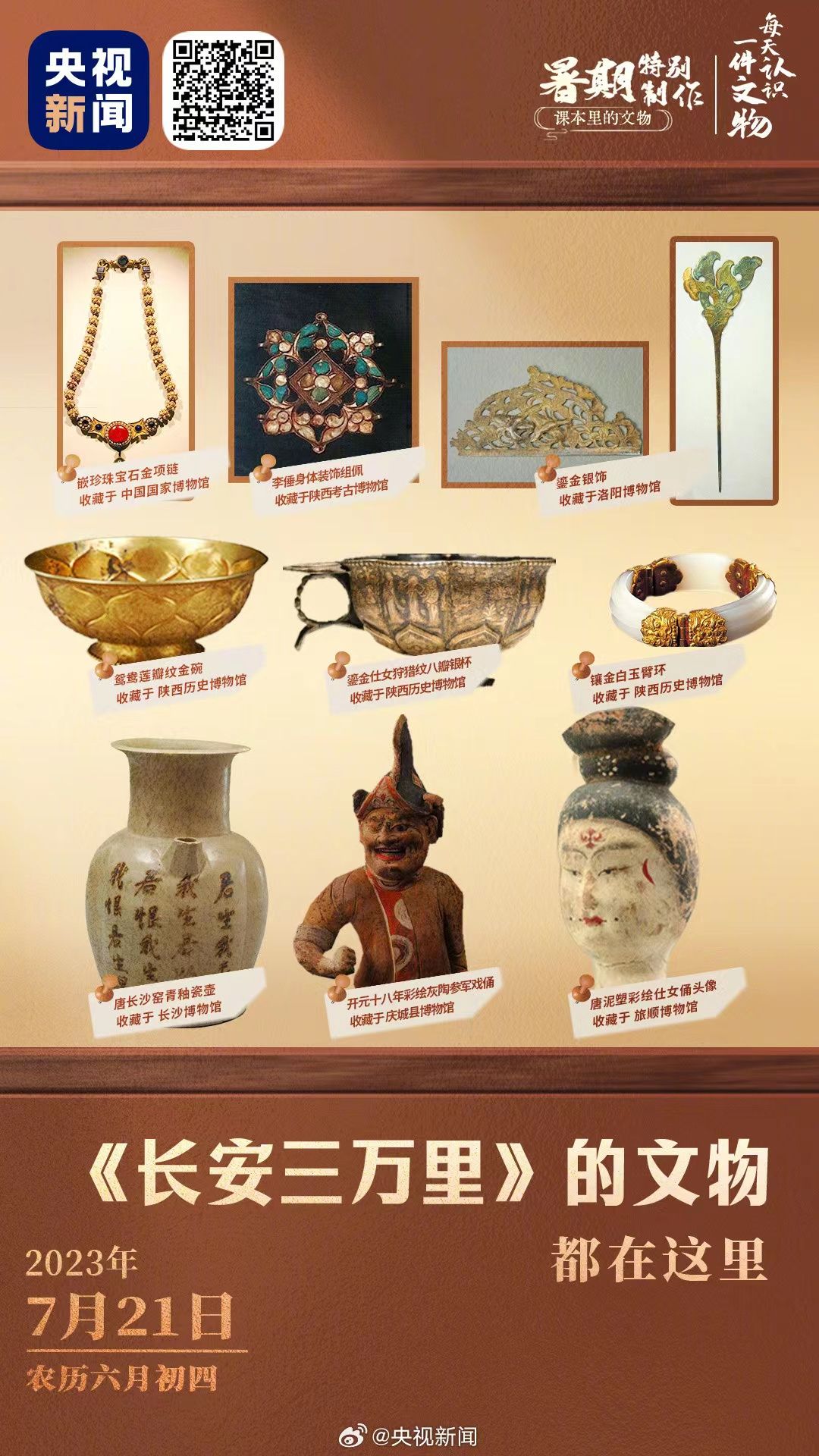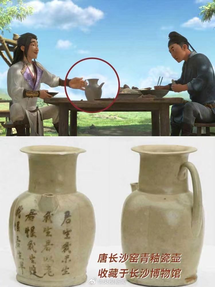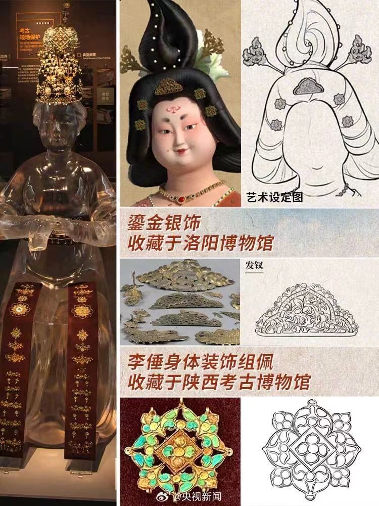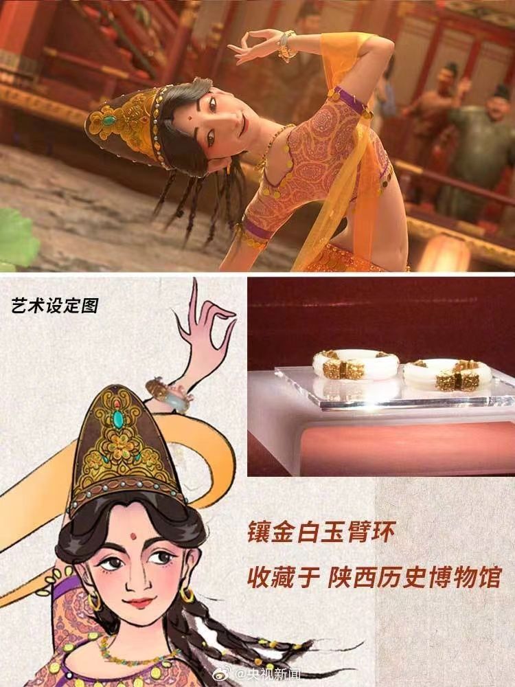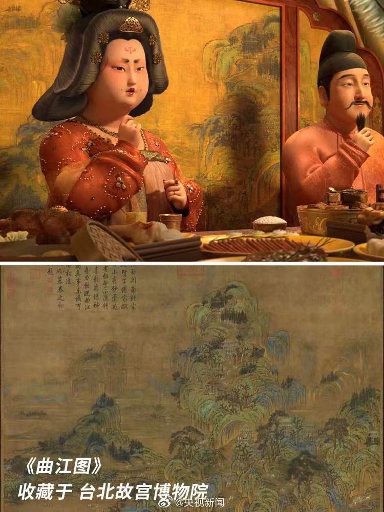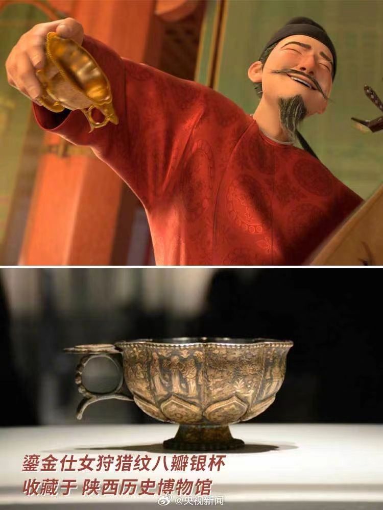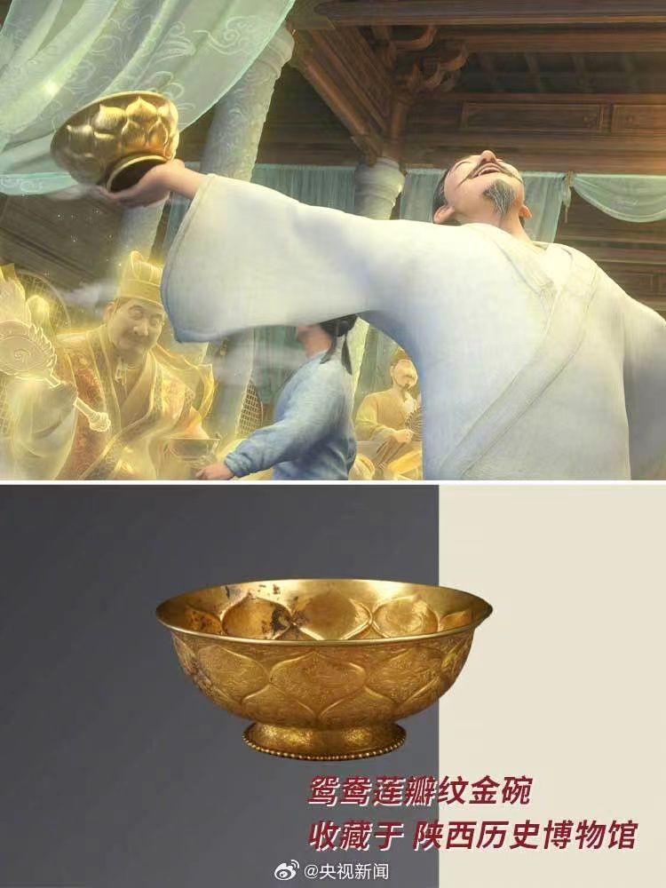 你注意到了吗?正在热映的《长安三万里》中,有好多一闪而过的文物形象。李白诵将进酒端的碗是大唐文物同款,与陕西历史博物馆所藏的鸳鸯莲瓣纹金碗,几乎一模一样;玉真公主戴的项链,取自隋代李静训墓出土的嵌珍珠宝石金项链;公主与岐王身后的屏风上,画着曲江池游人如织的繁华景象,出自李昭道的《曲江图》。
