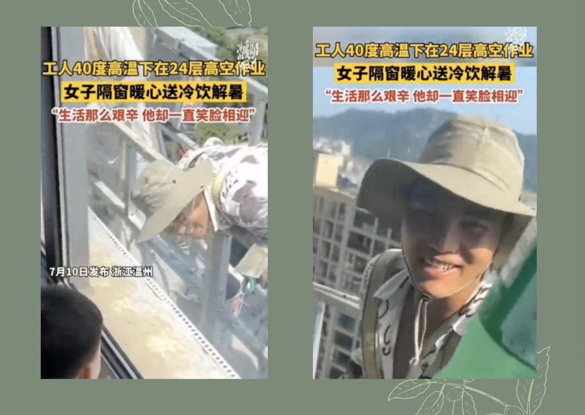 近日,浙江温州一女业主给40℃高温下24层墙外作业的工人送大瓶冰饮,暖心举动令大批网友称赞:太阳无情,人间有情!视频中,女子给高温下高空作业的工人师傅递上了一大瓶冰镇雪碧,还暖心说道:“辛苦啦!”小哥回了一个腼腆微笑,对女子真诚地道谢。女子称:“高温烈日下,高空作业很不容易的,第一次送水,他们不要,第二次给他们的时候才收,我们心里也是很开心的。”