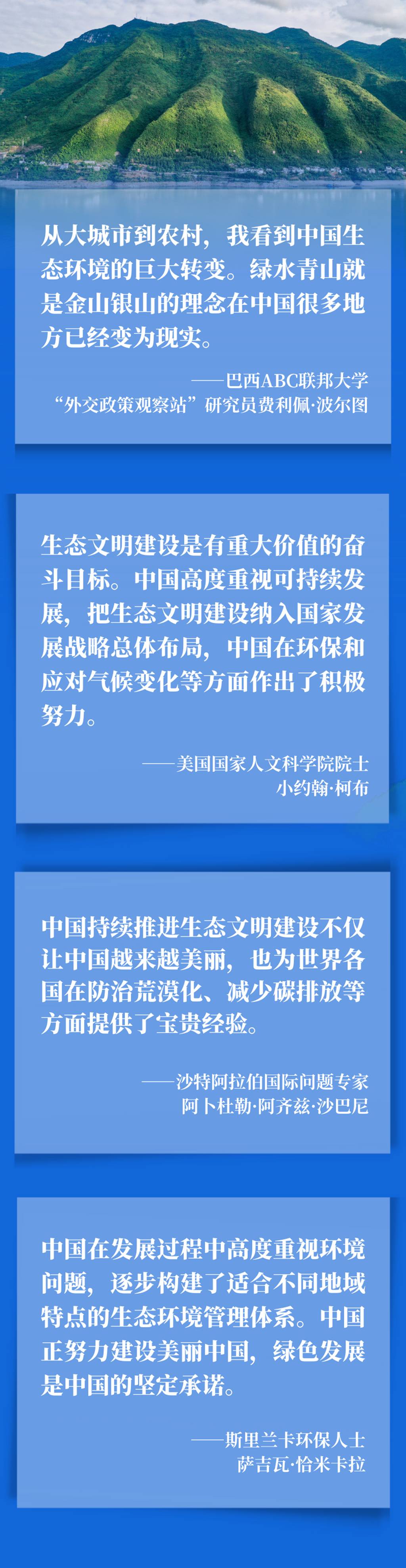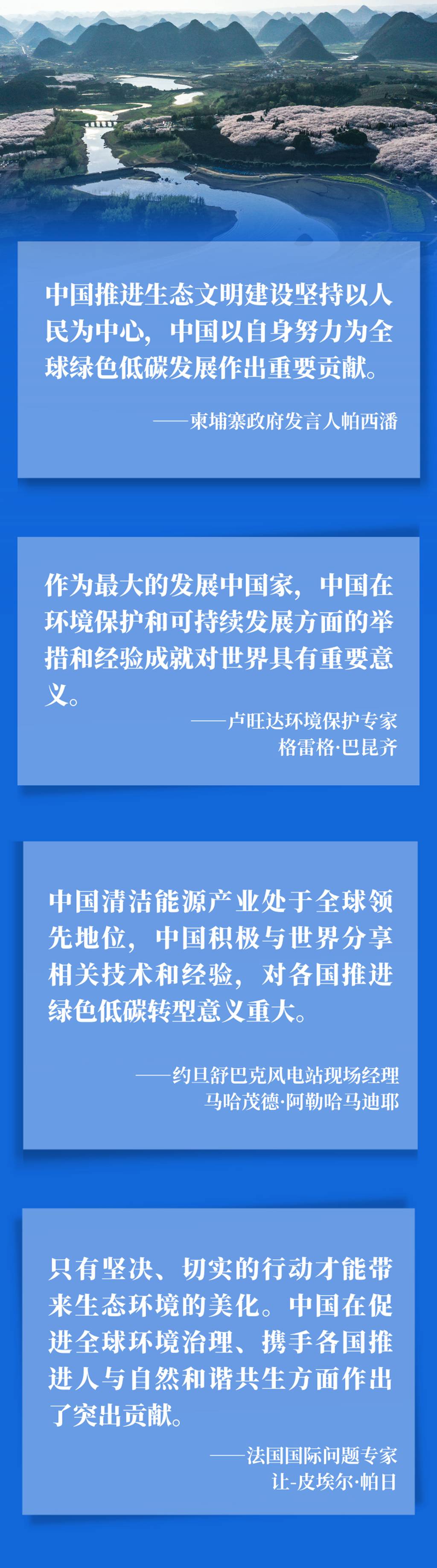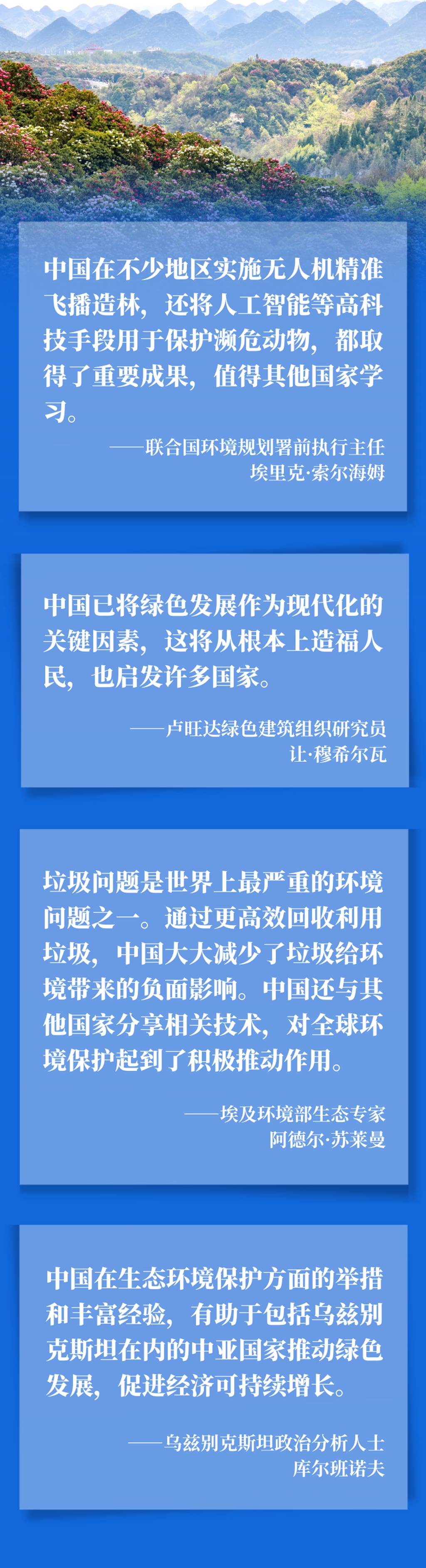 多国官员、环保等领域专家学者高度评价习近平总书记的重要讲话,认为中国持续推进生态文明建设,取得举世瞩目的巨大成就,实现由全球环境治理参与者到引领者的重大转变,相信中国将继续为全球可持续发展、建设更加美好的世界作出重要贡献,为世界各国绿色发展提供宝贵借鉴。