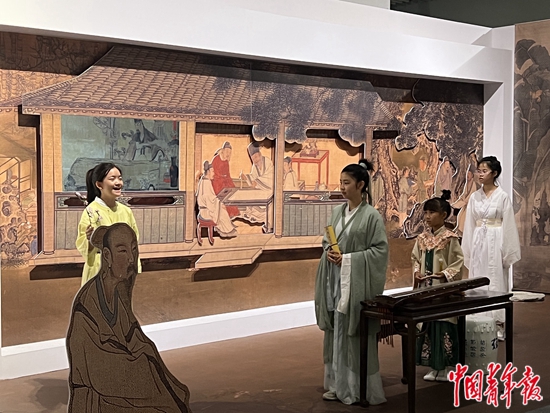 在布置古朴的中国园林博物馆《长物·居园》展区,12岁的赵佳仪身穿汉服,在一段古琴演奏后流畅地开启了历史小短剧的序幕。随后,小“白居易”“文徵明”“宋徽宗”依次登场,跨越时空“穿越”而至,共同上演千年后的“曲水流觞”。