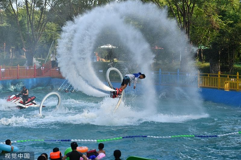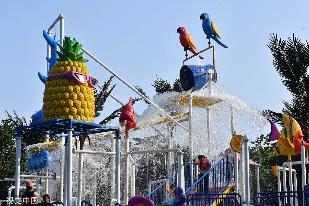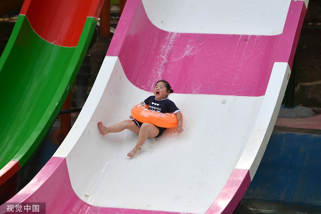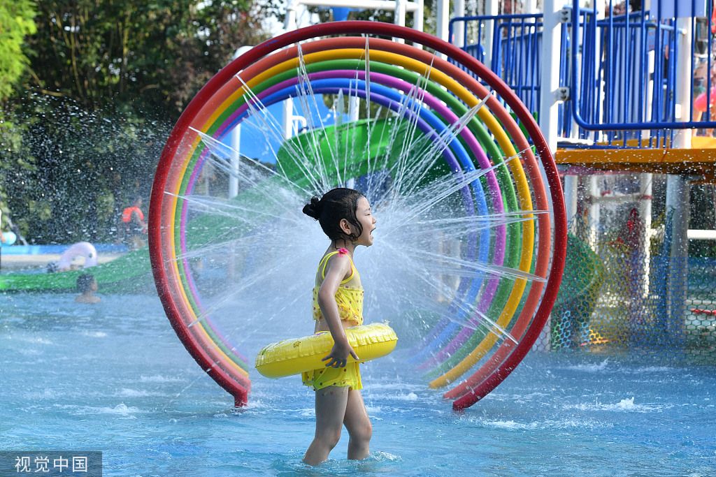 7月22日,河南商丘,在夏邑县樱花园水上乐园,小学生在戏水游玩。入伏以来,河南省商丘市夏邑县连续多日发布高温预警,学生和家长选择戏水消暑乐享清凉。