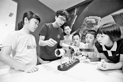 7月12日,山东省济南市舜华路街道涵玉翠岭社区暑期托管班,志愿者给孩子们讲解航天知识。郝鑫城摄/光明图片