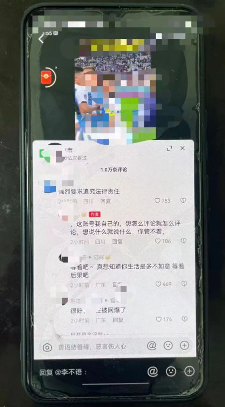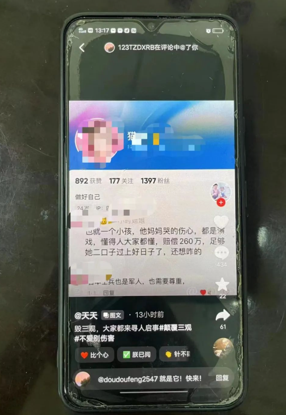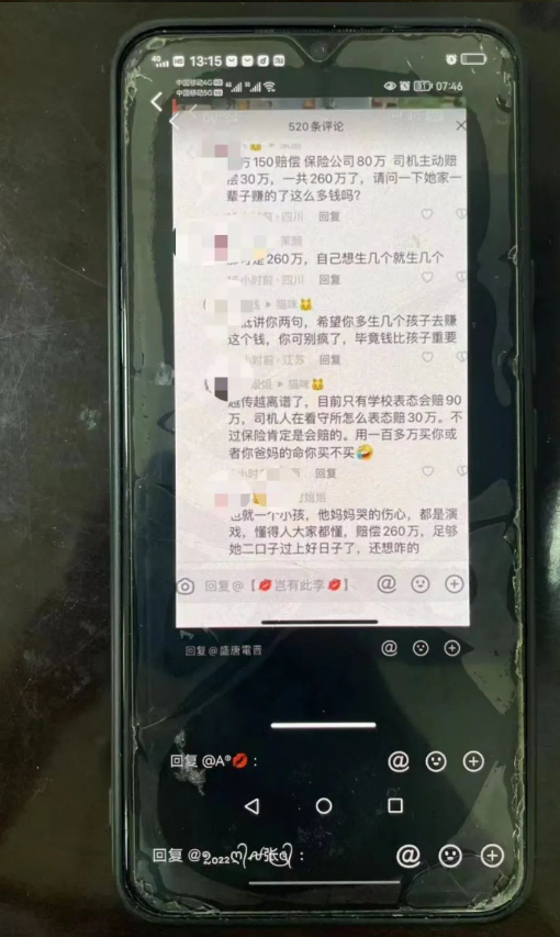 一IP属地为四川的抖音网民曾多次在死者母亲抖音账号贴文下发布“小孩妈妈哭的伤心都是演戏,一共赔偿了260万足够他们一家人过上好日子,还想怎样”、“校方150万赔偿,保险公司80万,司机主动赔偿30万,一共260万了,请问一下她家一辈子赚的了这么多钱吗?”等不当言论。