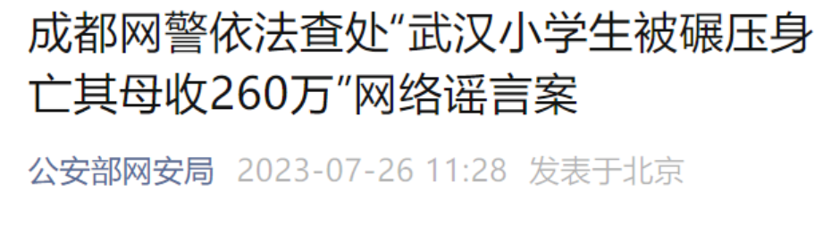 据公安部网安局消息,近日成都网警依法查处“武汉小学生被碾压身亡其母收260万”网络谣言案。