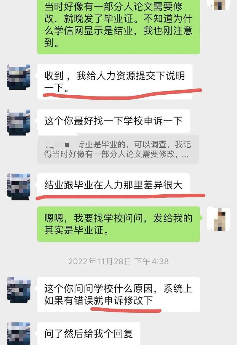 张倩今年39岁,去年11月份她在更换工作的过程中,发现了自己学信网的学历信息显示为结业,“我当时换的新工作已经通过面试,年薪20万左右,但是在入职背调的过程中,公司方发现我的学信网学历信息显示为结业,就停止了我的入职流程,并要求我尽快去申诉变更。”