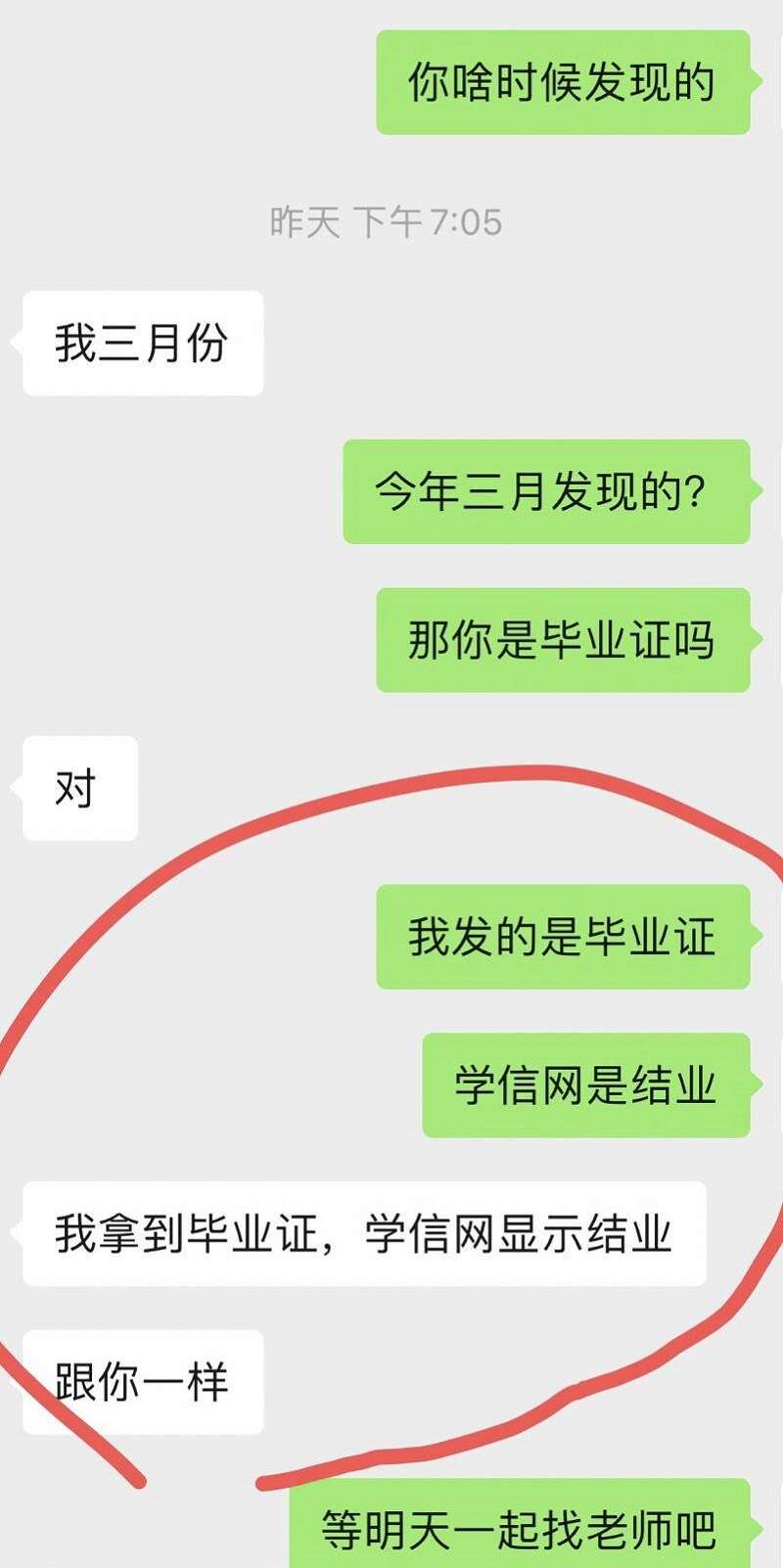张倩表示,自己是2007年从上海印刷出版高等专科学校正常毕业,“不过那个时候好像还没有学信网这个平台,我们的学历信息应该是学校后来录入的。”张倩将自己的经历分享到了大学班级群,没想到有其他同学表示自己也有相似经历,而且一直都没有更正过来。“我联系了当时的班主任,她说学校陆续有同学的学历信息都错了,应该是在手工录入数据的时候发生的,才都变成了结业,而且更改手续也是比较繁琐。”