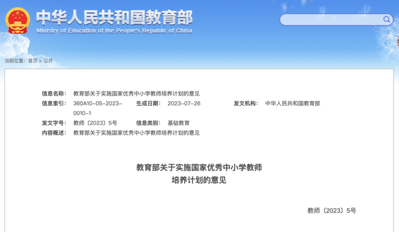 中国青年报客户端北京7月27日电(中青报·中青网记者 樊未晨)记者从教育部获悉,为深入实施科教兴国战略,夯实创新人才培养基础,教育部印发了《教育部关于实施国家优秀中小学教师培养计划的意见》(以下简称“国优计划”《意见》),从2023年起,国家支持“双一流”建设高校为代表的高水平高校选拔专业成绩优秀且乐教适教的学生作为“国优计划”研究生,在强化学科专业课程学习的同时,系统学习教师教育模块课程(含参加教育实践),为中小学输送一批教育情怀深厚、专业素养卓越、教学基本功扎实的优秀教师。