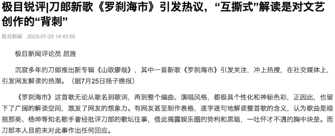 极目新闻指出,在没有确切依据的情况下,直接将歌曲解读为抨击某些个人,试图从中咂摸出更多陈年的八卦谈资,再引发一轮饭圈互撕,其实是对作品意义的窄化,更是对创作的一种“背刺”。