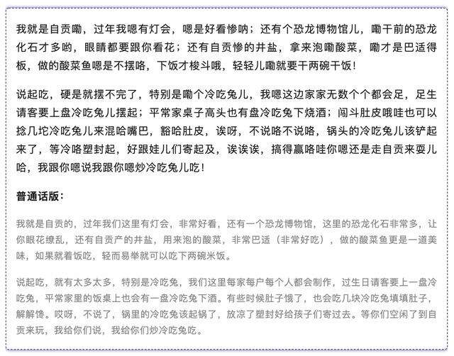 自贡话汇集南腔北调,将盐文化融入其中,形成了独具特色的地方语言。有人说自贡人一开腔,外地人就晓得你从哪里来。