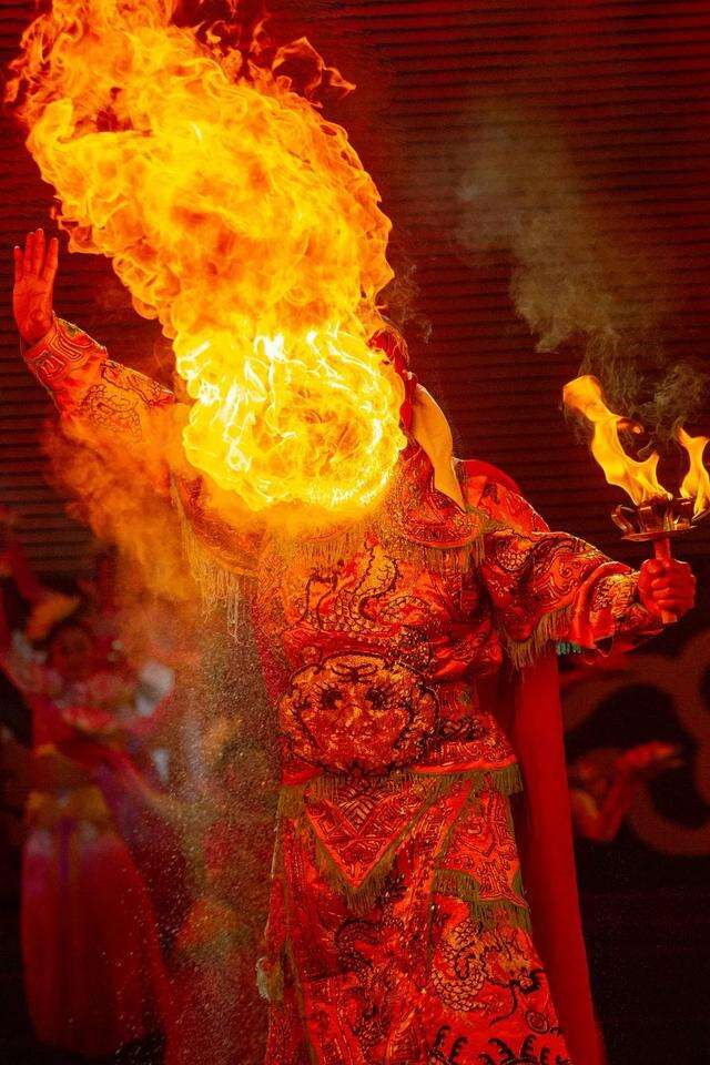 为了更好地塑造人物,川剧艺人创造了变脸、吐火、滚灯、踢袍、甩水袖等许多绝技,表演时火爆热闹、新奇有趣,也形成了川剧的一大特色。