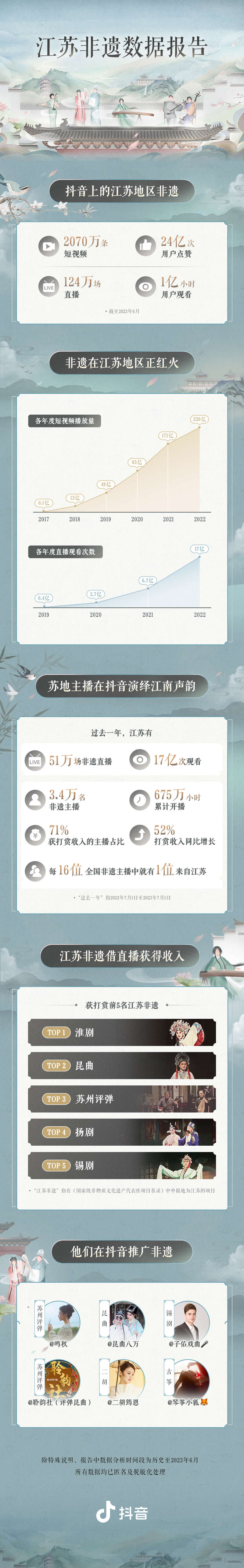 戏曲、曲艺等演艺类江苏非遗,不仅在抖音获得大量关注,还通过展演成功创收。据统计,平台上获打赏的前5名江苏非遗项目为淮剧、昆曲、苏州评弹、扬剧、锡剧。