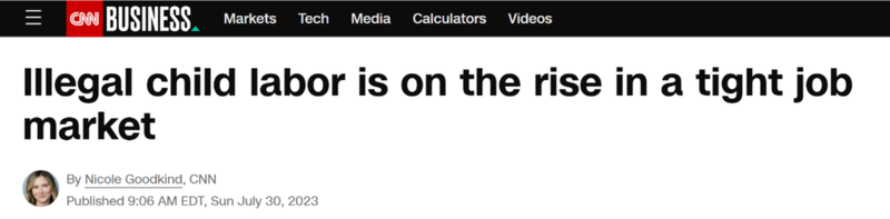 《纽约时报》(New York Times)今年早些时候的一项调查指出,全美各地的工厂雇佣童工的情况自2021年以来“呈爆炸式增长”,“旨在保护儿童的制度已经崩溃”。
