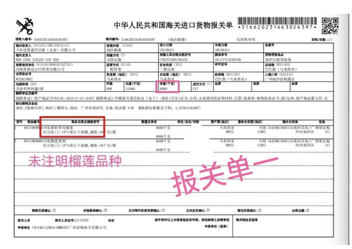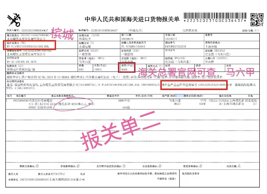 为何一个榴莲有两份报关单?且内容不一致,赵先生怀疑报关单有问题,“我通过中国海关总署官网查到第二份报关单里的境外生产企业在华注册编号,显示这家企业的生产场所地址在马六甲,不是平台宣传的彭亨州猫山王榴莲。”