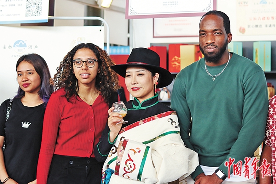 7月20日,青海西宁,青海国际会展中心,留学生在商品贸易馆品尝当地青稞酒,并和展区工作人员合影。中青报·中青网见习记者 余冰玥/摄