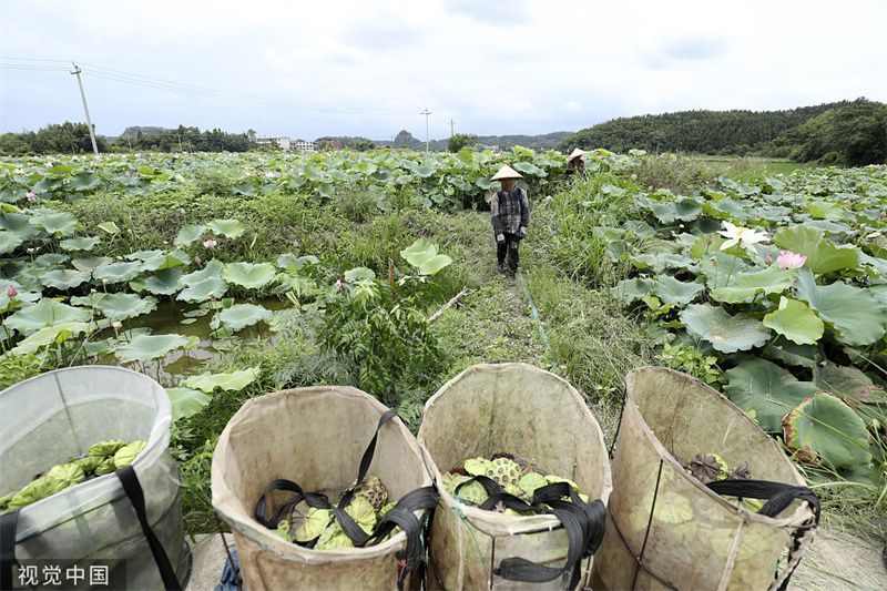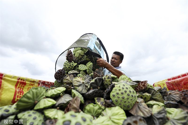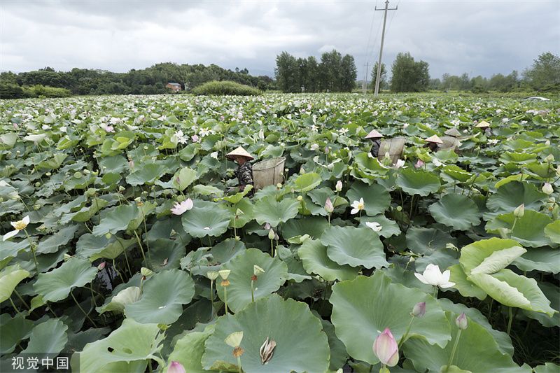 2023年8月1-2日,湖南郴州,资兴市唐洞街道程水村的600余亩湘莲进入收获季,当地农户忙着采摘莲子进行保鲜、烘干等加工。近年来,当地在做好粮食安全和耕地保护的前提下,大力发展“莲子经济”,走乡村振兴特色产业发展之路,带动村民增收致富。
