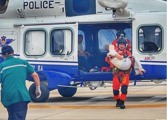11时30分,在警航基地内,三辆120救护车早已准备就绪。11时45分,救援直升机平安落地后,6名伤员被顺利送上救护车。沙河医院随车医生张晨昊表示:“6名伤员都有不同程度的骨折和创伤感染,其中两人行动困难。”