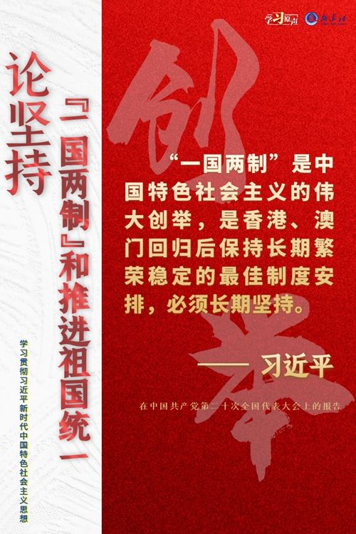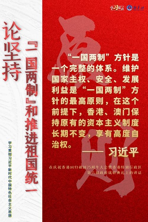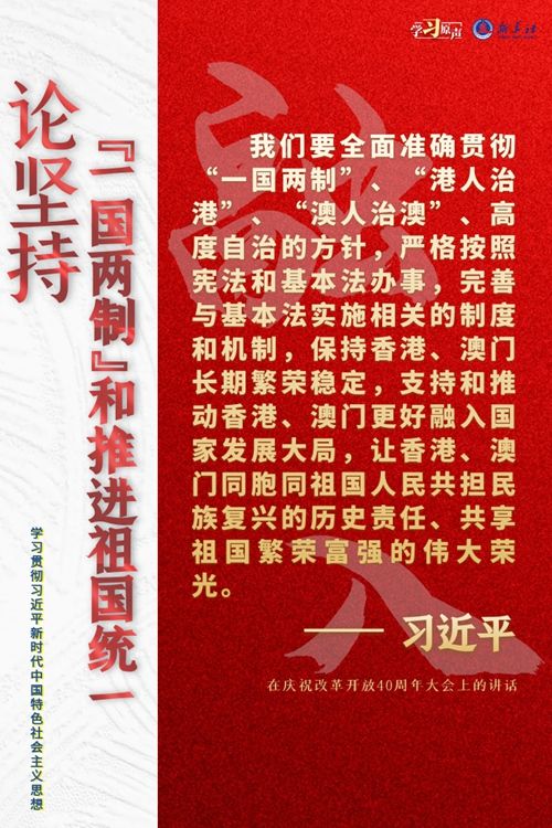 “一国两制”是党领导人民实现祖国和平统一的一项重要制度,是国家的一项基本国策。中国特色社会主义进入了新时代,意味着“一国两制”事业也进入了新时代。不断推进“一国两制”在香港、澳门的成功实践,是中华民族伟大复兴历史进程的重要组成部分。