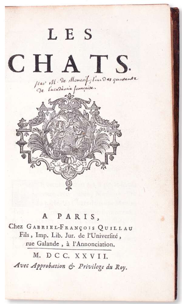 不过,猫可不是轻易就能被人类驯服的动物。法国作家、学者弗朗索瓦-奥古斯丁·帕拉迪·德·蒙克里夫(François-Augustin Paradis de Moncrif)曾担任宫廷秘书,熟悉宫廷的猫,对猫脾气也了如指掌。他在1727年出版的《猫族》(Les chats,图1)中讲了这样一个故事:一个女人迷恋她的猫,便给它穿上漂亮的衣服,戴上珍珠项链,并将它抱到镜子前,结果猫突然挣脱,逃跑。蒙克里夫认为,猫不喜欢受人摆布,一切带有服从气息的举动都和它们与生俱来的独立性相抵触。